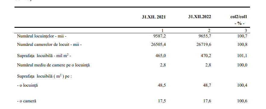 În 2022, suprafaţa medie locuibilă, potrivit raportului despre Fondul de Locuințe, furnizat de Institutul Național de Statistică a ajuns la minimul ultimilor 20 de ani, la 48,7 metri pătraţi. Din compartimentarea multor locuințe au dispărut cămara, debaraua și în unele cazuri, holurile.