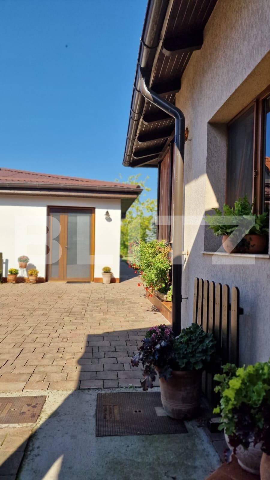Exteriorul: Curtea bine întreținută include un loc pentru grătar cu chiuvetă și spațiu pentru gătit, perfect pentru seri relaxante. Garajul a fost transformat într-un salon cu parte de relaxare și loc pentru servirea mesei. Există și o baie de serviciu, o cameră tehnică, un dressing spațios și o spălătorie. Sub casă, veți găsi o pivniță complet amenajată, ideală pentru depozitare.