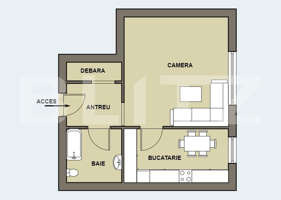 Blitz ofera spre vanzare un apartament cu 1 camera situat in zona Alfa. Apartamentul este spatios, luminos, orientat spre sud, spre curtea din spate, cu o suprafata utila de 45 mp. Pozitionat la parterul unui bloc nou, din cărămidă, termoizolat la exterior 10 cm. Compartimentarea apartamentului este decomandata si dispusa astfel: camera zi open space cu dormitor, bucătărie mare cu loc de cămară, baie spatioasa ce dispune de cada, hol cu spatii de depozitare, debara.