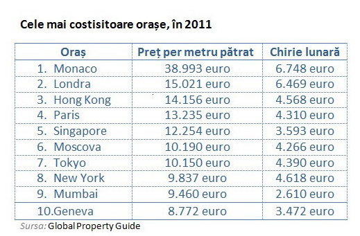 Astfel, conform datelor de mai sus, in Londra, pretul pe metru patrat este putin peste 15.000 de euro iar chiria medie lunara, putin peste 6500 euro. Parisul ocupa locul 4 la nivel mondial si a treia treapta a podiumului in topul celor mai scumpe orase europene.