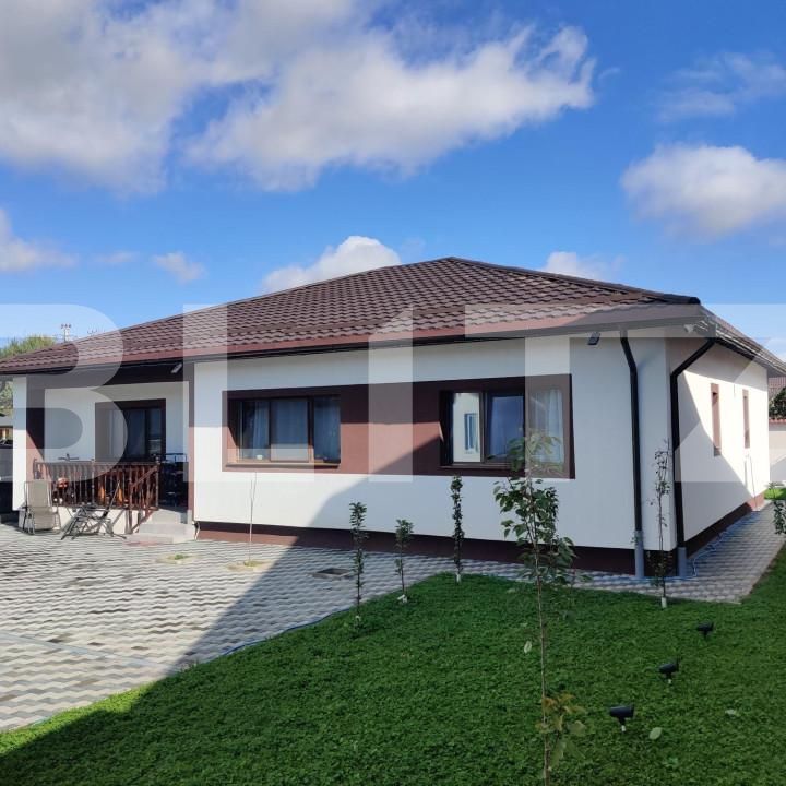 Baia de la dormitorul matrimonial este cea mai mare si este compusa din: jacuzzi, chiuveta dubla, bideu, mobilier, oglinzi cu iluminare led /dezaburire si vas wc. A doua baie are o chiuveta mare, cabina dus dubla, mobilier oglinda iluminare led/ dezaburire si vas wc. Baie de serviciu are cabina dud, chiuveta, pisoar si vas wc. Toate grupurile sanitare au geamuri mari 600/100 cm si rezervoare pentru toaleta Geberit. Mobila (bucatarie, hol, bar si dressing executata la comanda). Bucatarie e complet utilata si dotata (masa foarte mare, 6 scaune foarte comode din piele naturala, combina frigorifica imensa LG side by side cu dozator apa/cuburi gheata, masina de spalat vase Tesla, aragaz profesional Beko (5 ochiuri) cu cuptor electric, hota foarte performanta 700 mc/h cu iesire de 160 mm, chiuveta Franke din material compozit, mobilier la comanda acoperit de blat gros (32mm). Lumina naturala din bucatarie este asigurata de doua geamuri 120/180 cm. În dresingul generos sunt 6 dulapuri mari (pentru haine si încaltaminte) cu cate 4 usi fiecare, masa de calcat, masina de spalat haine si cea de uscat haine. Toate cele 10 usi de interior (4 decupate cu geam sa patrunda lumina naturala) provin de la VaryoDoor si au un sistem de prindere cu 3 balamale (fiind pline si foarte grele) sunt de ce-a mai buna calitate. Toate geamurile sunt cu trei foi de sticla si tâmplarie Salamander culoare nuc cu 7 camere. Încalzire sa efectuat prin pardoseala si este asigurata de o centrala termica pe gaz Immergaz Victrix Terra de 32 kw si are 6 termostate în 6 zone diferite, asta pentru a putea face economie de gaz cu un sistem inteligent de redirectionare a agentului termic acolo unde este nevoie fara a porni centrala.. ATENTIE casa are placa din beton armat turnata, deci se poate construi peste înca 2 etaje si mansarda. (atât este înaltime maxima prevazuta în PUZ). Rezistenta fiind asigurata de cele 4 grinzi cei 16 stâlpi din beton armat (B350). Toata casa e iluminata cu un sistem inteligent pe led cu 4 intensitati. Proprietatea dispune de un sistem video CCTV cu camere performante Hikvision de 6 si 8 mp si un video interfon. Totii robineti si bateriile sunt branduri premium (Giaconimi, Schell si respectiv Ferro). Pentru o intimitate sporita, proprietatea este împrejmuita cu gard din boltari de beton pe 3 laturi iar cea de a 3 latura este din gard de lemn.