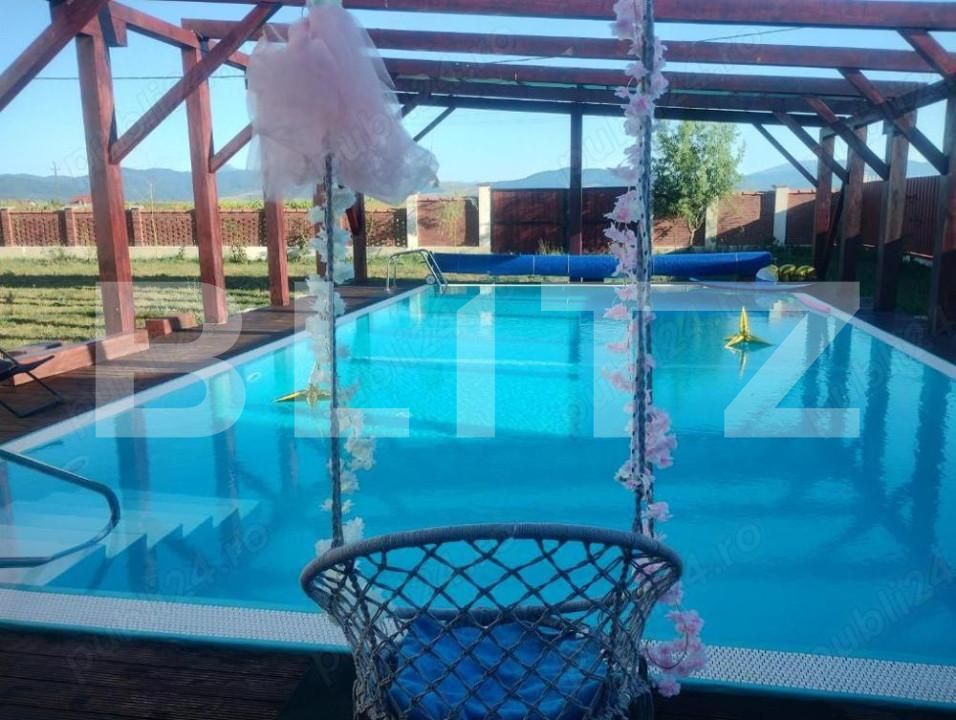 Piscina exterioara este incalzita (dim.:12x6m), probabil cea mai frumoasa dintre cele din zona Brasov.