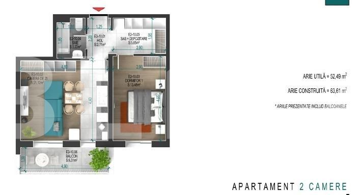 Apartament are su 52. mp, decomandat, cu 2 camere, bucatarie open space, grup sanitar, hol, sas+spatiu depozitare si balcon deschis de 6.31 mp, termen de finalizare in trimestrul IV 2022. Dotarile standard ale apartamentului sunt : centrala termica in condensatie, usa metalica exterioara, grupul sanitar utilat cu obiecte ceramice de calitate iar finisajele ( gresia, faianta, parchetul si usile interioare ) se pot alege dintr-o gama variata de nuante si modele calificate dupa cerinta viitorului proprietar.