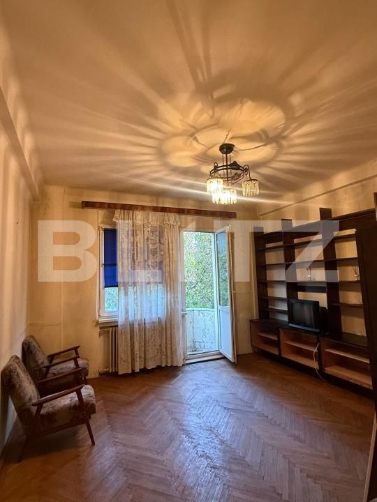 Locuința este compartimentată în două încăperi, dintre care una spațioasă, potrivită pentru living sau dormitor matrimonial, iar a doua mai compactă, ideală ca birou sau zonă de dormit single. Există deja ferestre termopan, ceea ce reprezintă un avantaj pentru confort termic și fonic. Apartamentul necesită renovare completă, fapt ce îi oferă viitorului proprietar libertatea de a-l amenaja după propriul stil și necesități.