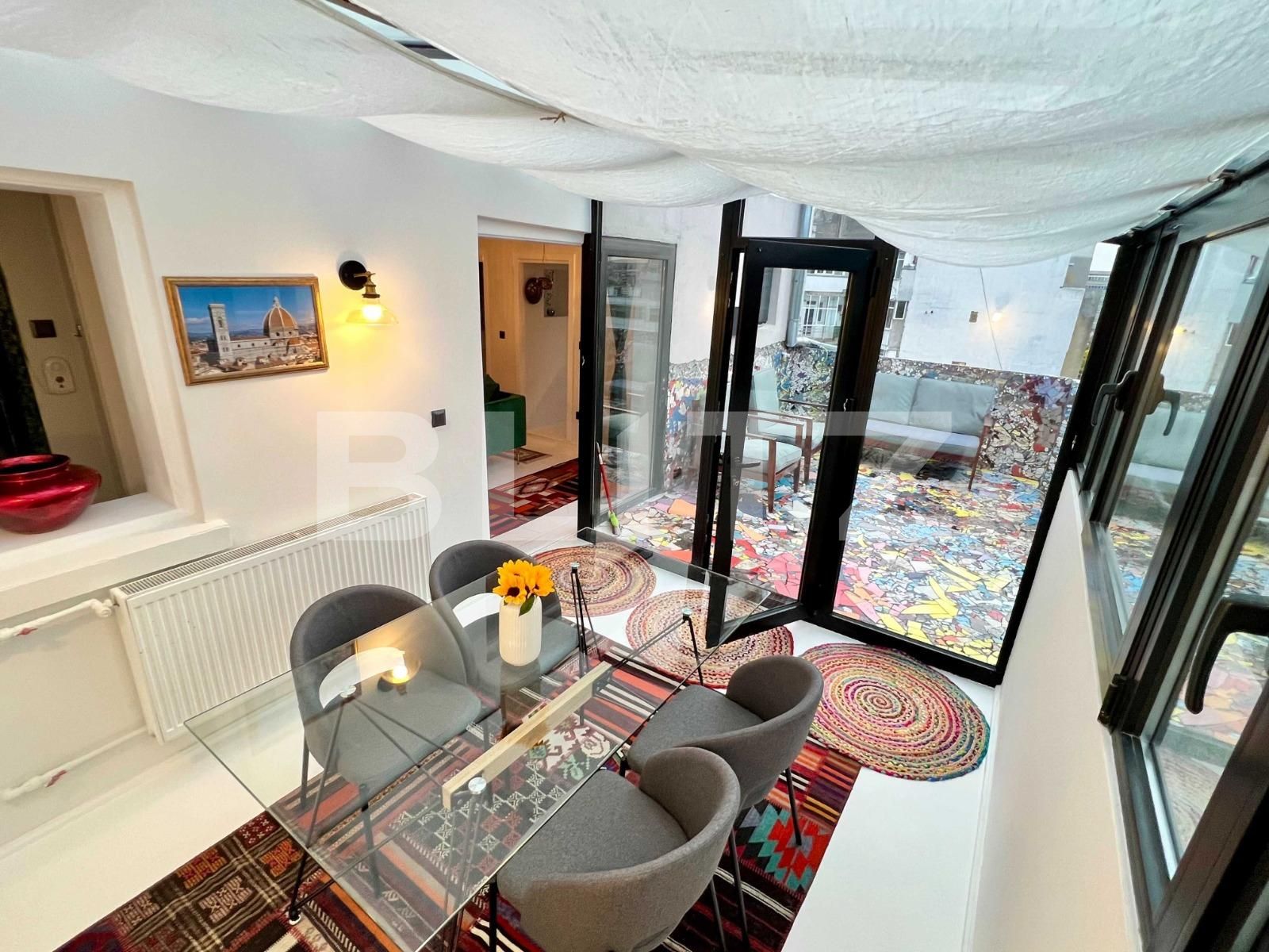 Apartament UNIC ca Design in Bucuresti: 60 M util, 22 M terasa fata, 5 M terasa spate, 2 boxe, una subsol si una mansarda renovata complet. Terasa neacoperita, bucataria si cele 2 bai sunt lucrate manual cu mozaic, ceramica si oglinda. Bloc 1946, risc seismic U2 (urgenta 2) 100 M mers pe jos pana la Sala Palatului. 50 M mers pe jos pana la gradina Cismigiu. Semidecomandat. Etaj 7 din 8. Termopan peste tot, 3 straturi, Germania, montat in 2017. Terasa fata are vedere spre Stirbei Voda, colt cu Luterana. Terasa spate are vedere spre Casa Poporului, Cismigiu, Conservator. Blocul este Vis a vis de Conservator. Caldura este pe centrala blocului. Caloriferele sunt din fonta masive, pastreaza pe termen lung caldura. 1 Singur aer conditionat in dormitor mic. Contract Curent la HidroElectrica din Octombrie 2022. Internet Wi Fi Digi. Bucataria are frigider nou si plita electrica. Masina de spalat noua. Posibilitatea de a se pune panouri fotovoltaice, deasupra terasei sau apartamentului. Tot apartamentul a fost renovat complet, de la zero in vara 2022: instalatie electrica, finisaje complete, mobila noua in tot apartamentul + covoare persane si romanesti. Terasa mare este impartita in 2: una acoperita si izolata pentru luat masa, una neacoperita, de relaxare pentru bronzat, relaxare, sport. Apartamentul se vinde la cheie, cu tot ce contine in el, gata pentru oricine de mutat si se poate vedea in poze Pretul nu este negociabil.