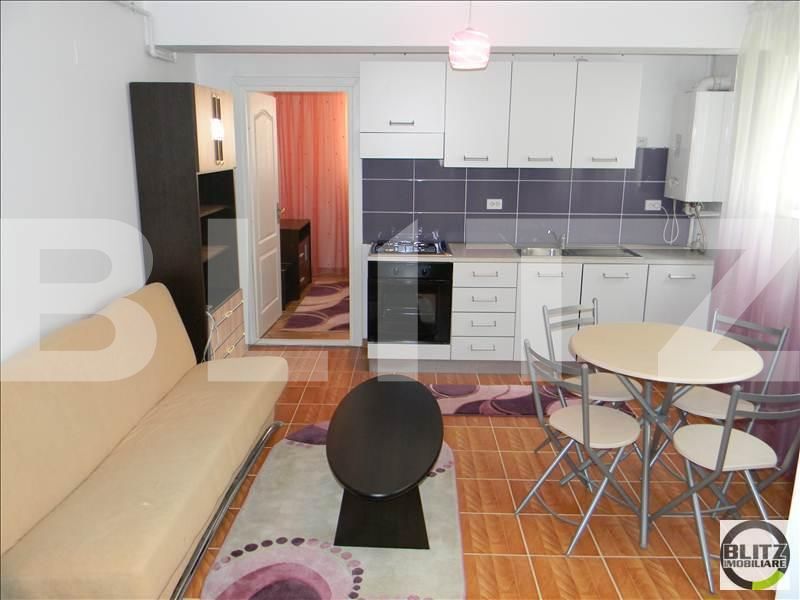 Apartamentul este semidecomandat dispune de o bucatarie cu living tip open space din care se face intrarea in dormitor. Mobilierul este modern, bine intretinut, in dormitor este un pat dublu matrimonial iar in living o zona de luat masa, o canapea extensibila, precum si dulapuri cu spatii generoase de depozitare