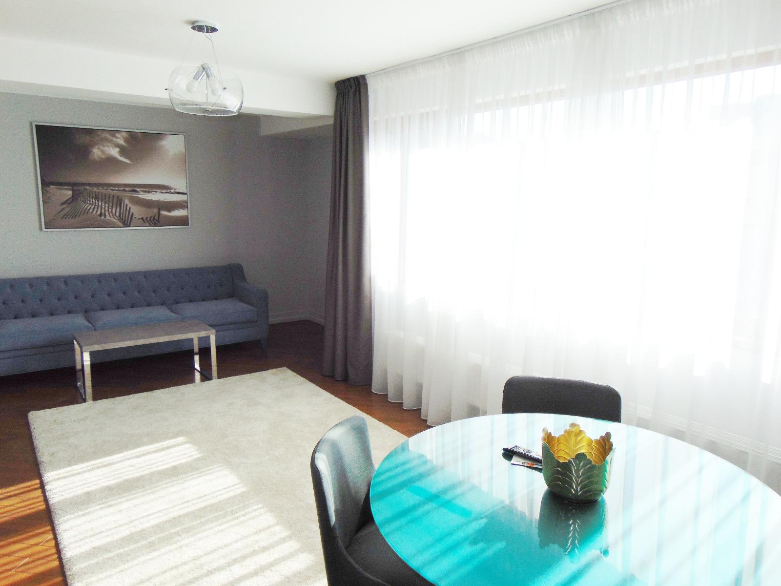 Living open space cu bucataria are o structura deptunghiulara, fapt ce-ti confera posibilitatea de a avea o imagine de ansamblu si facilitandu-ti o comunicare buna cu bucataria. Vei remarca foarte usor canapeaua confortabila intr-un albastru imperial, o zona de dining cochet amenajata si bucataria in forma de L, ce ofera un blat intins de lucru, dar si plita si cuptorul incorporat.