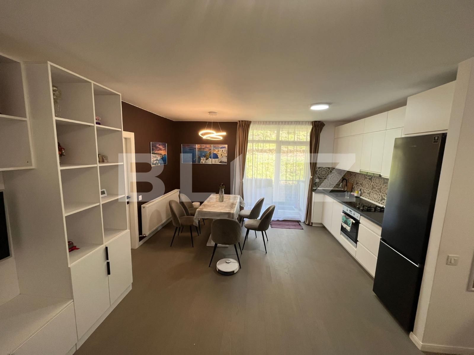 Blitz ofera spre vanzare apartament de 2 camere decomandat, in Ansamblul Rezidential din Baciu. Apartamentul se preda complet mobilat - utilat ultra modern, amenajat de designer, centrala termica proprie, usa metalica la intrare si geamuri din termopan. Suprafata utila a apartamentului este de 56 mp + 39 mp terasa, compartimentarea prezentandu-se astfel: living cu spatii de depozitare generoase, de tip open space cu o bucatarie moderna, cu toate electrocasnicele incorporate, o zona de intrare larga, luminoasa, un dormitor mare cu pat dublu, matrimonial, un dormitor mic,o baie eleganta si bine accesorizata, un balcon deschis. Cei care aleg sa locuiasca aici pot beneficia si de un loc de parcare cu CF separat si tot la pachet cu apartamentul, se vinde si o boxa finisata, cu rafturi.