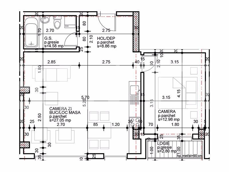 Compartimentarea este semidecomandata si dispusa astfel: living cu bucatarie, dormitor, baie, hol si o logie.