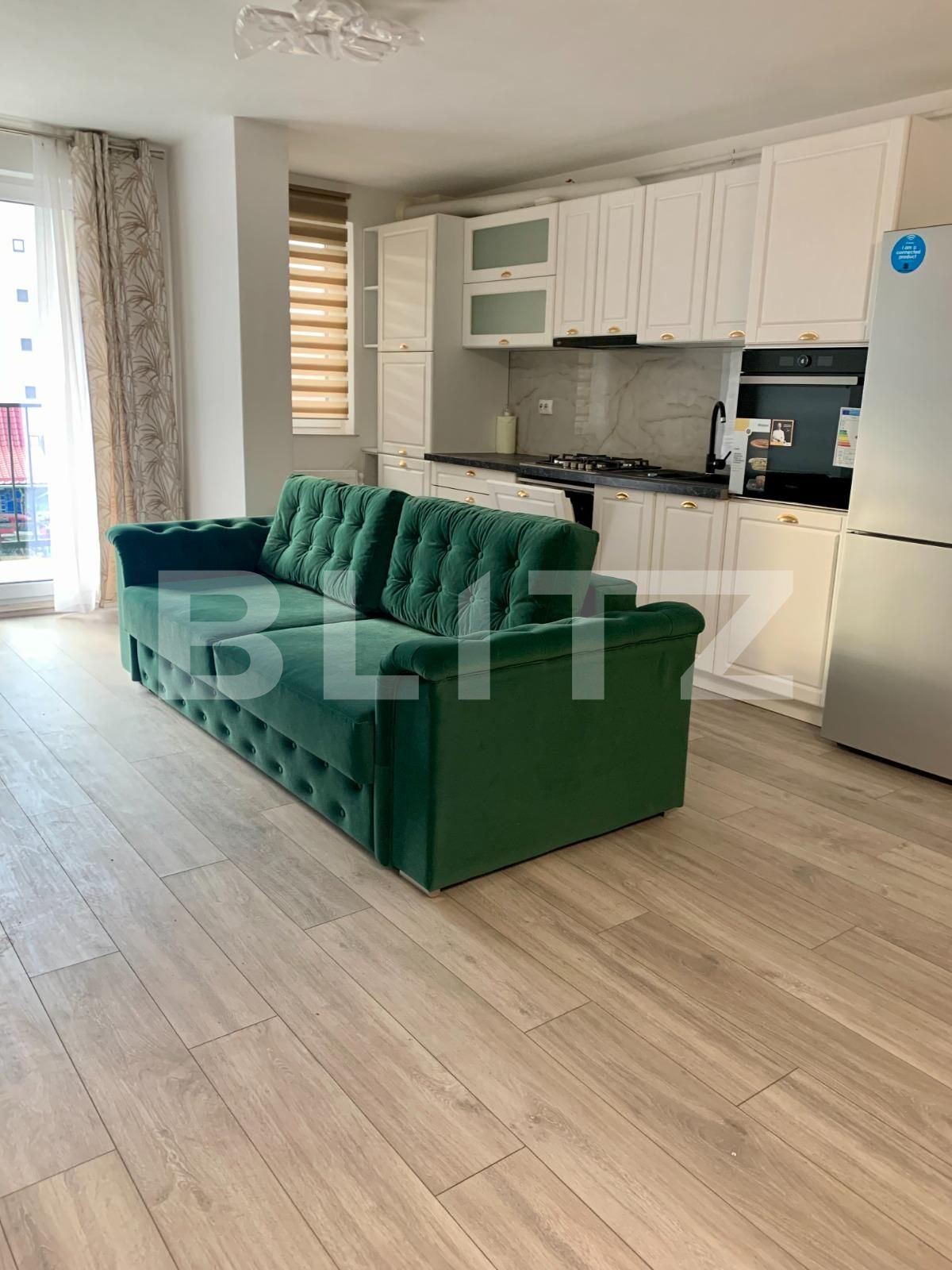 Interiorul apartamentului este amenajat cu atenție și bun gust, oferind o atmosferă primitoare și plăcută. Livingul luminos și spațios este amenajat cu mobilier modern și confortabil, ideal pentru relaxare sau pentru petrecerea timpului alături de familie și prieteni. Bucătăria deschisă este complet utilată și echipată cu toate electrocasnicele necesare, oferindu-ți posibilitatea de a pregăti delicioasele tale rețete cu ușurință.