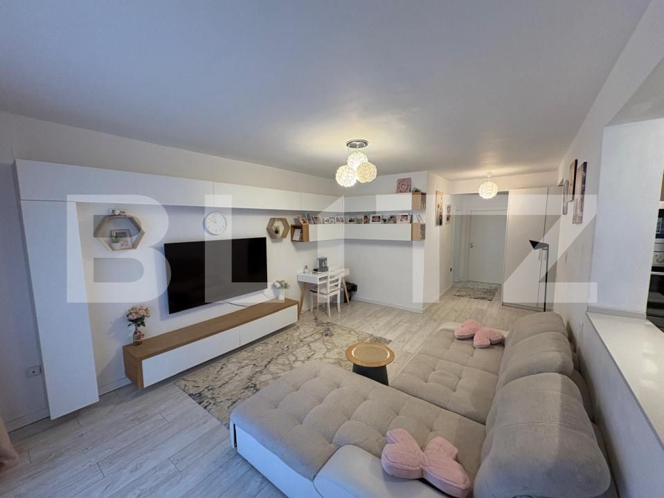 Vrei sa locuiesti intr-un apartament mobilat cu gust? Sa te muti direct fara a fi nevoie de a mai investi? Atunci Blitz iti propune spre vanzare apartament de 2 camere semidecomandate situat in zona Florilor din Floresti. Apartamentul este situat intr-o zona excelenta pentru investitie, fiind la 2 minute de mers pe jos de magazine, parcuri si farmacii. Apartamentul este situat la etajul 1 al unui imobil cu regim de inaltime P+4, finalizat in anul 2008. Suprafata utila este de 58mp si se prezinta astfel: living open-space cu bucataria, dormitor, baie, debara si balcon deschis de 6mp. Beneficiaza de finisaje si mobilier calitativ, totul fiind facut la comanda si se vinde utilat(exceptie fac masina de spalat, televizorul si uscatorul ) si complet mobilat dupa cum se vede in poze. Mobila este facuta la comanda dupa dimensiunile apartamentului, fiind pus in valoare tot spatiul. Un plus de valoare este bucataria foarte bine gandita, cu multe spatii de depozitare, cu electrocasnice incastrate, blat de bucatarie din Quartz compozit, avand chiuveta incastrata, aerul conditionat pentru confort si debara de aproximativ 3mp. In pretul apartamentului este inclus si un loc de parcare exterior! Nu mai sta pe ganduri si programeaza o vizionare!