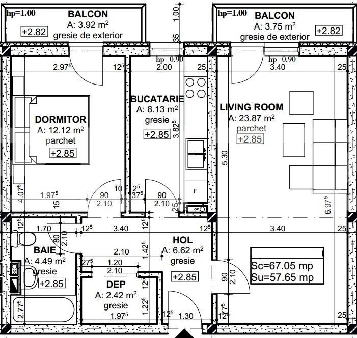 Suprafata utila este de 57.65 mp, iar compartimentarea se prezinta astfel: bucatarie, hol, doua dormitoare, o baie si doua balcoane.