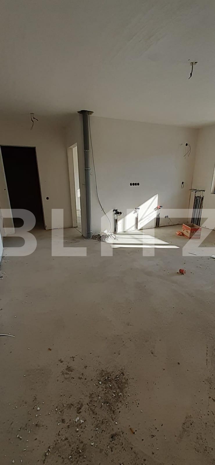 Blitz ofera spre vanzare un apartament cu 2 camere, situat intr-un ansamblu rezidential in zona Eroilor, din Floresti. Apartamentul este pozitionat la etajul 3 al unui imobil nou dotat cu lift iar regimul de inaltime este D+P+3E+ER. Suprafata utila de care dispune este de 45 mp, iar compartimentarea semidecomandata se prezinta astfel: bucataria open space cu livingul, hol, dormitor, baie, balcon cu debara inchisa cu suprafata de 7 mp. Se ofera spre vanzare la stadiul de semifinisat, cu sapa autonivelanta, instalatii trase la pozitie, peretii gletuiti, centrala termica si calorifere, geamuri termopan cu tamplarie PVC, usa metalica antiefractie la intrare, interfon cu touch screen + camera video, contoare de gaz, apa si curent.