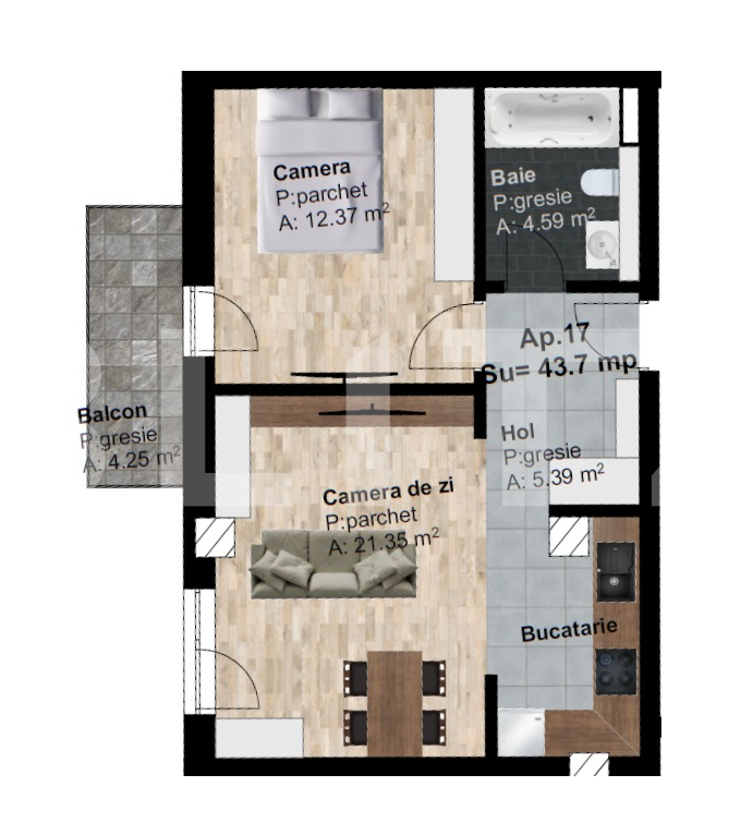 Suprafață utilă: 43.7 mp