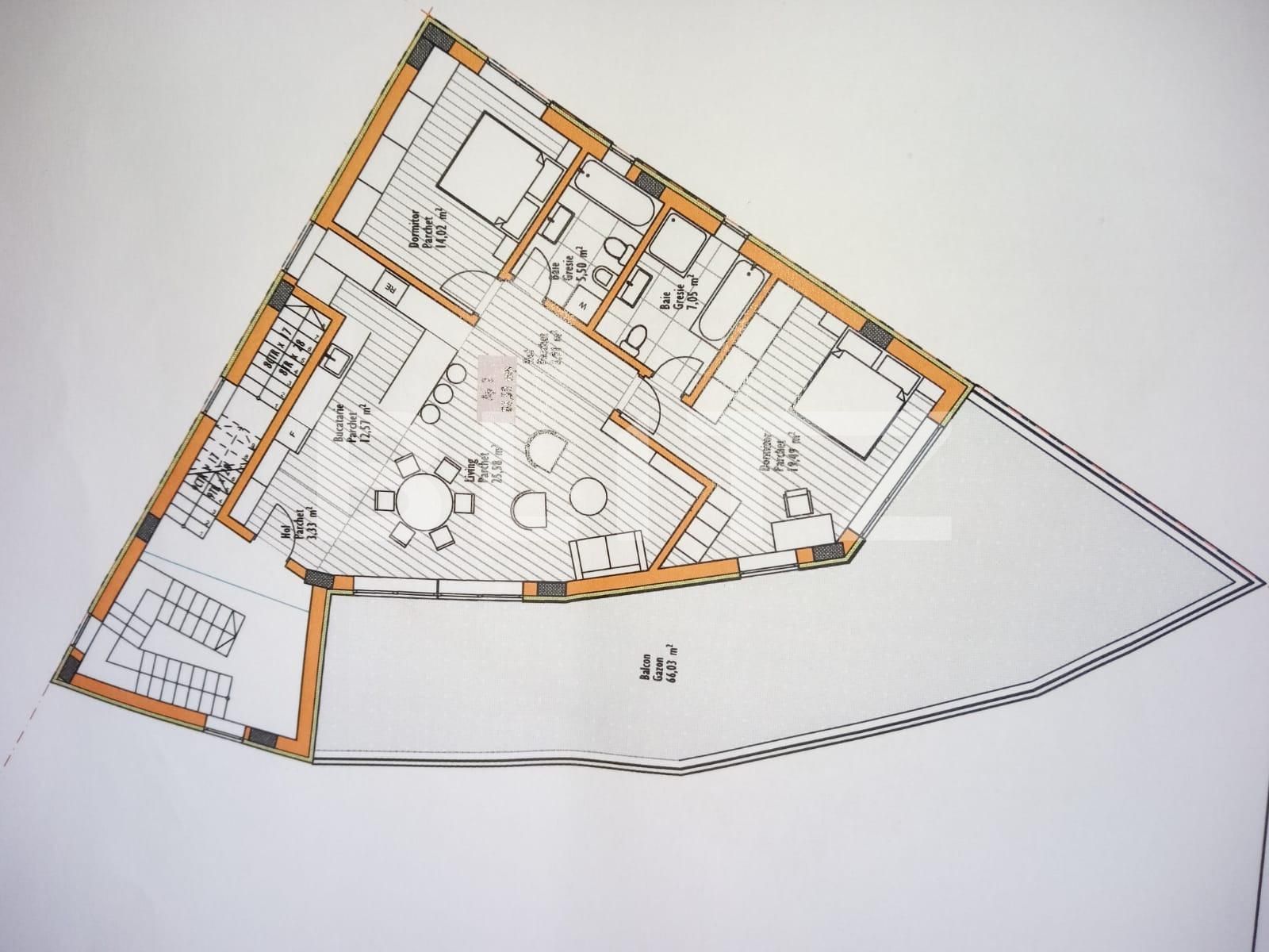 Apartament semidecomandat, bucatarie inchisa, terasa de 64 mp, zona centrala