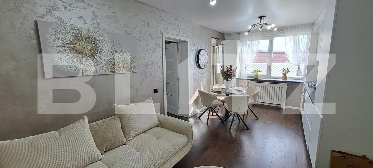Complet mobilat și utilat de lux, electrocasnice Gorenje, masina de spalat/uscator, incorporabil, frigider/congelator incorporabil, plita pe gaz, cuptor electric, hota incorporabil Interfon cu touch, prizele/ intrerupatoare touch Luxion Italia, mobilier la comanda, de calitate superioară. Finisaje moderne și elegante stuco/parchet 12 mm, riflaje decorative.