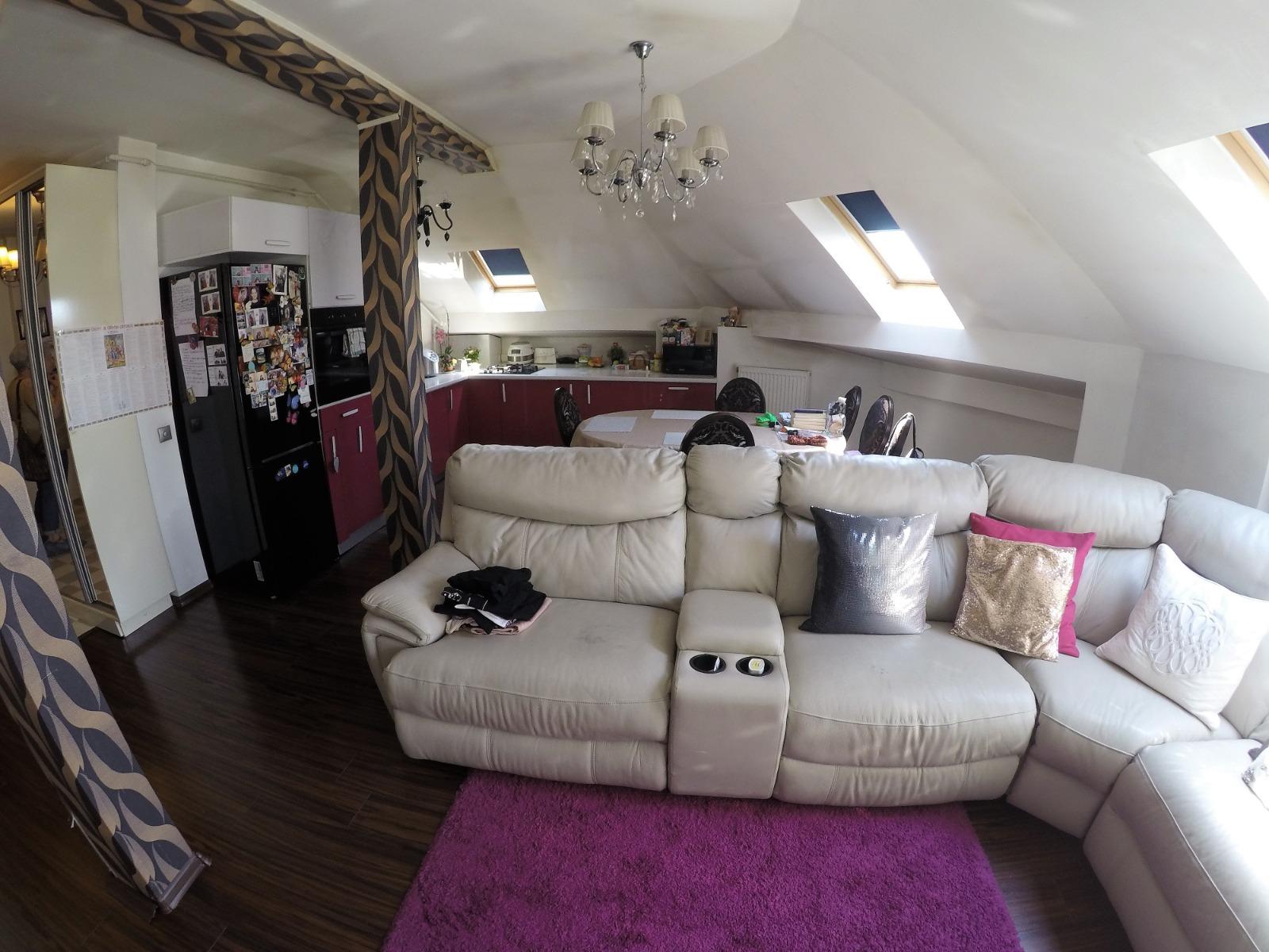 Blitz Imobiliare ofera spre vanzare apartament cu 4 camere, situat in zona Petrom, din cartierul Baciu. Apartamentul este pozitionat la mansarda unui imobil cu 4 nivele si dispune de o suprafata utila de 110 mp. Compartimentarea este gandita astfel: 3 dormitoare decomandate, living cu bucatarie, 2 bai si hol. Beneficiaza de centrala termica proprie, aer conditionat, geamuri termopan cu tamplarie din PVC si usa metalica la intrare. Se vinde complet mobilat, in pret fiind inclus un garaj.
