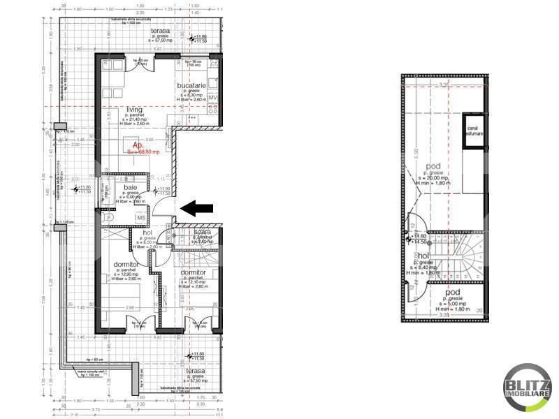 Etaj 4: living si bucatarie open space, 2 dormitoare, 2 bai, hol si 1 terasa cu o suprafata de 57 mp.
