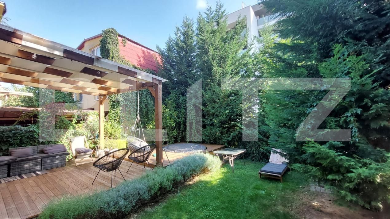 Zonă de recreere: Amenajată cu iarbă verde, brazi falnici care asigură intimitate, arbuști decorativi, o terasă acoperită și un jacuzzi relaxant – locul ideal pentru a evada din cotidian.