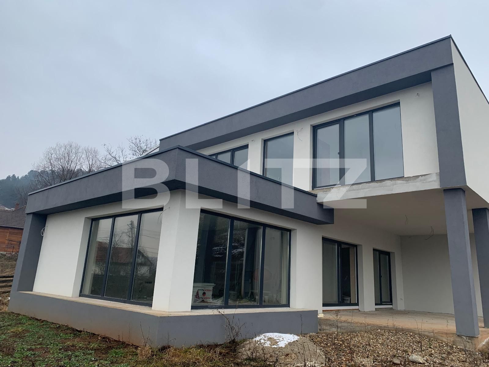 Casa este in stadiu semifinisat, construita recent in stil modern minimalist pe doua nivele avand in total 160 mp utili, cu un teren ingradit generos de peste 1000mp, cu panorama/priveliste frumoasa din toate directiile, avand in vecinatate preponderent case noi familiare fiecare cu terenuri generoase (astfel zona este aerisita si nu ingramadita de case/duplexuri), cu acces rapid la statie (sub 5 min pe jos), la loc de joaca amenajata (sub 5 min pe jos), la magazin alimentar (sub 10 min pe jos), la supermarketuri (sub 10 min cu masina), la scoala/gradinita (sub 10 minute pe jos) si acces direct in natura (drumetii, padure, off-road, sanius iarna, etc.).