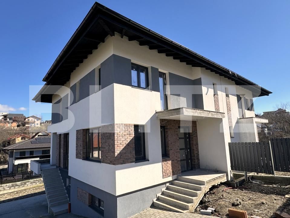Extraspatiu de depozitare, in pod, sub acoperisul de tip sarpanta invelit cu tigla cat si depozit sub casa scarii. Pentru a putea fi personalizata asa cum iti doresti, casa se preda la stadiul de semifinisat, cu centrala termica proprie si incalzire in pardoseala, geamuri panoramice triplex, instalatii trase la pozitie, cu sapa si peretii tencuiti si dispune de toate utilitatile: canalizare, apa curenta, gaz si curent.