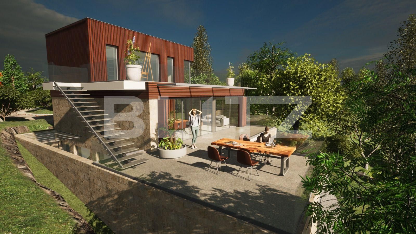 Frumusețea acestei case excelează prin designul său sofisticat și echilibrat, care se îmbină armonios cu mediul înconjurător. Terasele îngrijite care pot fi amenajate, înconjoară ansamblul locuinței si adaugă un farmec aparte și creează un spațiu ideal pentru a vă bucura de aerul curat al pădurii, răsfățându-vă cu vederi panoramice uluitoare asupra înălțimilor orășenești.