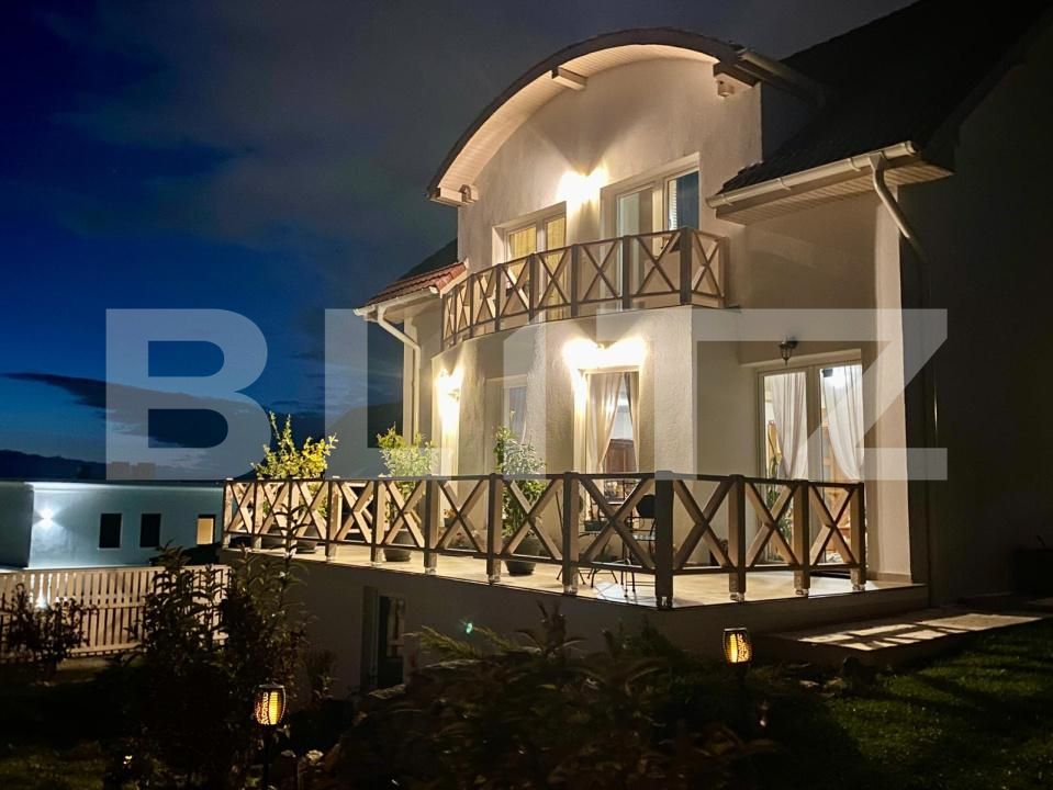 Blitz vă propune spre vanzare o casă finisată cu gust și personalitate, foarte versatilă, dotată cu o cascadă în curte și o priveliște cu iz de vacanta.Terenul total aferent este de cca 600mp din care parcela este de 470mp si 130mp cota de drum.