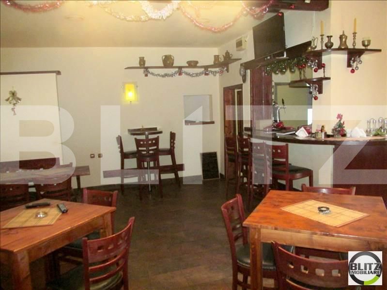 Accesul se face direct din strada, in curtea proprie cu o suprafata de 200 mp, fiind amenajata o terasa cu mese si scaune si arbori ornamentali, ideala pentru servirea clientilor. Spatiul comercial propriu zis are o suprafata totala de 100 mp, este construit din caramida si lemn, dispune de 3 incaperi si o bucatarie complet mobilatat si utilata si 3 grupuri sanitare.