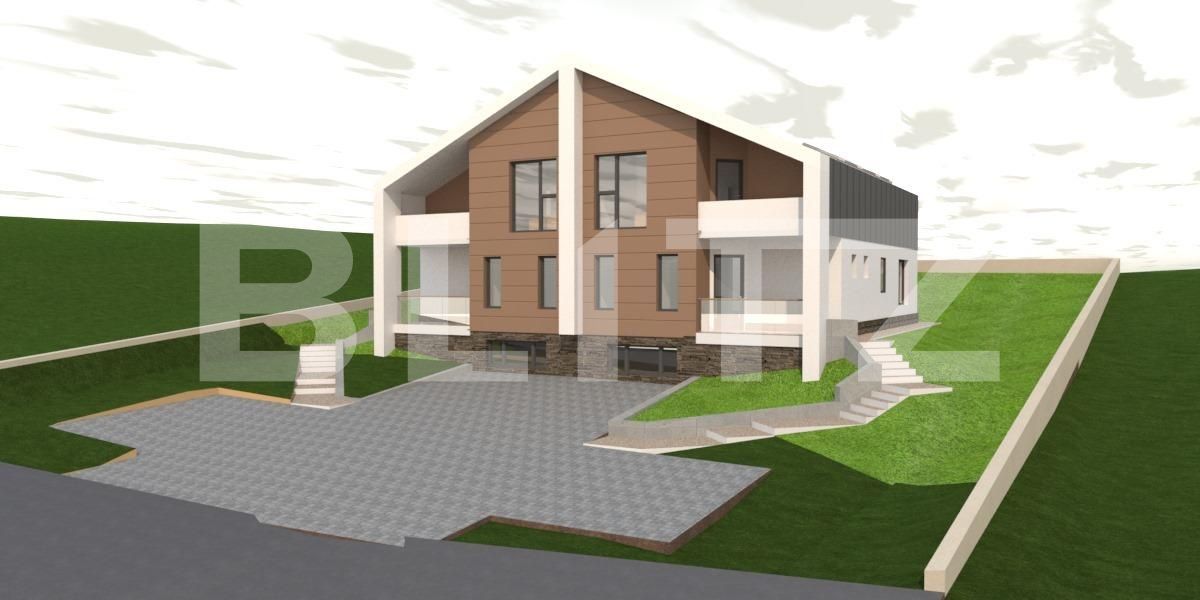 Blitz va ofera spre vanzare o parcela de 1100 mp dintr-un lot de aproximativ 2200 mp, intabulat, parcelat, cu Certificat de urbanism pentru construirea a 2 duplex-uri. Imobilul este situat pe o suprafata aproape plana, pozitionat la strada principala, avand o deschidere la drum de 45 ml. Utilitati precum apa, gaz si curent sunt trase la limita proprietatii. Exista Certificat de urbanism de constuire pentru un duplex cu regim de inaltime de S + P + M, cu o suprafata construita de 184 mp, POT = 16.79 si CUT = 0.41. Proprietatea dispune de 4 locuri de parcare, 2 pentru fiecare unitate locativa. De asemenea, in planul imobilului a fost prevazuta o terasa de vara acoperita pentru fiecare unitate in parte.