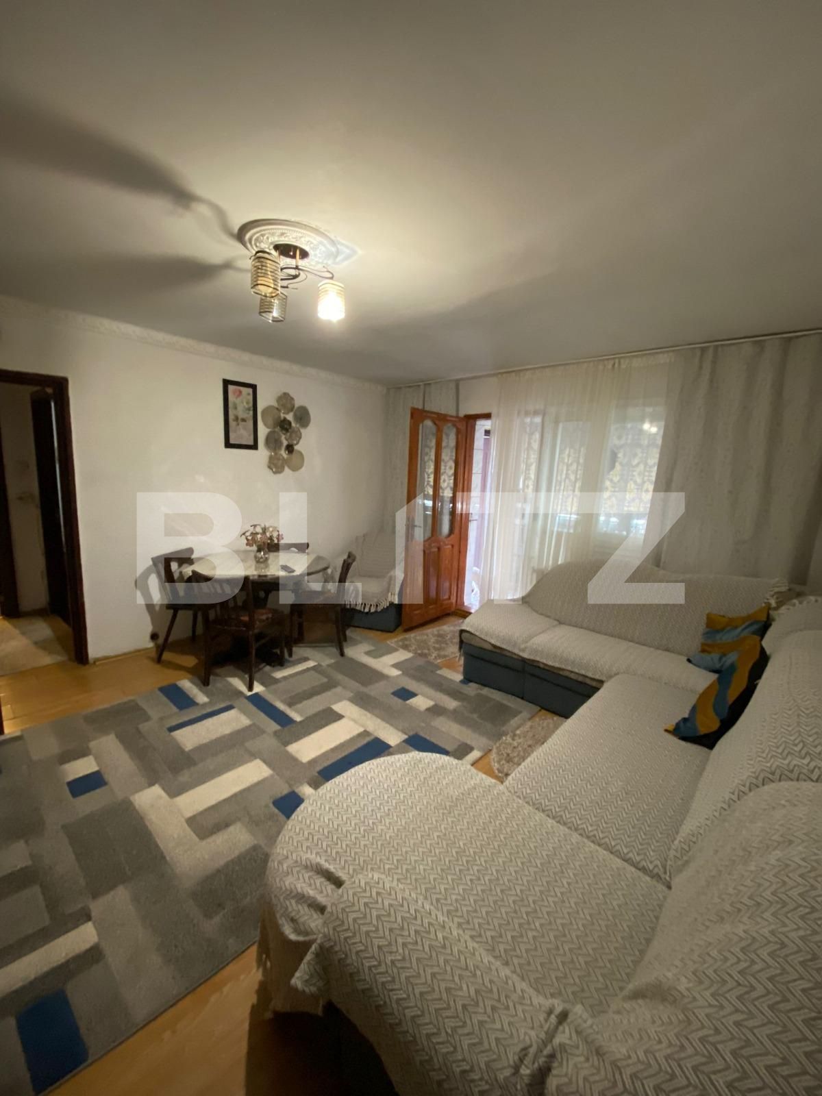 Blitz va ofera spre vanzare un apartamente de 2 camere, semidecomandat si cu o suprafata utila de 50 mp + 3mp de balcon. Acesta este situat la parterul unui bloc cu 4 niveluri. Apartamentul dispune de geamuri termopan, usa metalica la intrare. Bucataria a fost mutata pe balcon, apartamentul avand 2 camere transformate in 3, 2 bai, iar din balcon se face accesul in gradina blocului amenajata. In proximitatea zonei regasim scoli, gradinite, centre comerciale si medicale, locuri de joaca pentru copii.