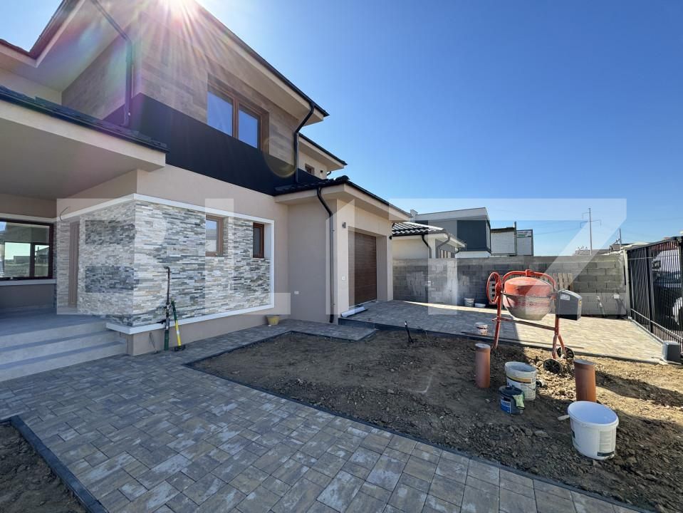 Casa se vinde la cheie și se va livra cu toate finisajele interior - exterior incluse, elemente decorative premium din patră și lemn, tencuială exterioară San Marco, uși de interior premium Porta Doors, porți metalice vopsite în câmp electrostatic și acționate electric prin telecomandă, ușă garaj automatizată, alei de acces din pavele premium, instalație electrică profesională, sistem de alarmă și camere de luat vederi Hikvision controlabile de la distanță, gazon tip rulou.