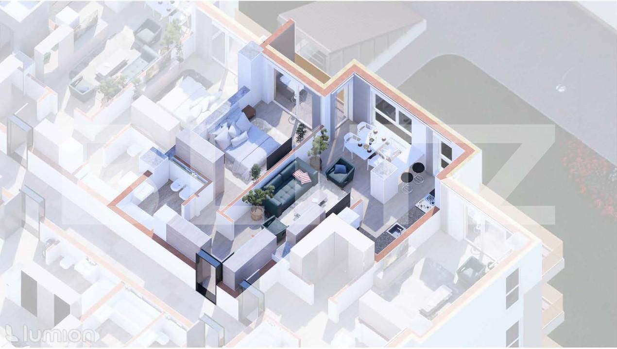 Apartamentul face parte dintr-un ansamblu cu vedere panoramică, finisaje personalizate, pompe de caldura, spatii verzi, loc de joaca, toate acestea armonizate într-o zona verde și cu acces facil la zona urbana, inclusiv cu o viitoare statie de transport public in apropiere.