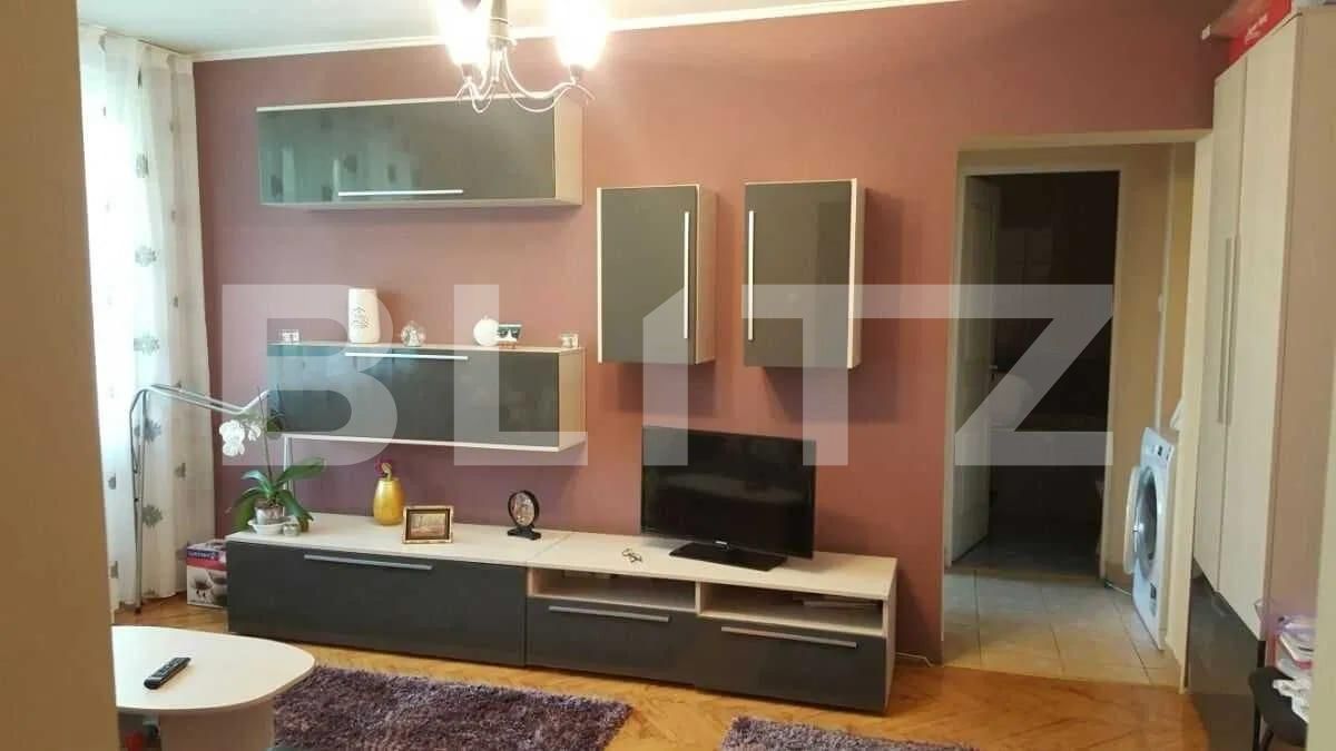 Imobilul vine cu o suprafarta utila de 45 mp si este situat la etajul 4 din 4 al unui bloc dintr-o zona linistita . Apartamentul este decomandat si vine compartimentat astfel: bucatarie mare si spatioasa , 2 dormitoare o baie cu cada , un hol , plus un balcon deschis . Vine mobilat si utilat cu absolut toate utilitatile : masina de spalat rufe , frigider , aspirator , aragz , cuptor cu microunde , aer conditionat , jaluzele la fiecare camera etc. Apartamentul beneficiaza si de loc de domiciliu