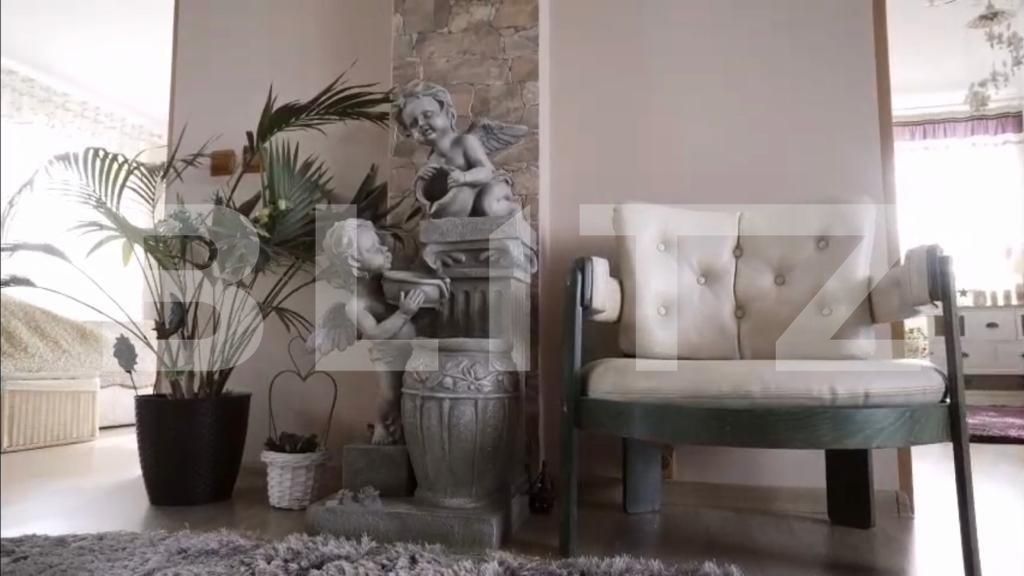 Casa construita in 2004 din materiale si finisaje de calitate, in anul 2017 s-au executat lucrari de reamenajare si renovare fiind schimbat complet acoperisul, cladirea a fost zugravita exterior si s-a repavat intreaga curte.Terenul are o suprafata totala de 5000 mp suprafata construita este de 220 mp .Cladirea este construita pe trei nivele la fiecare nivel existand doua apartamente de 100 mp fiecare.Apartamentele au living + bucatarie 45 mp, doua dormitoare de 17 mp si baie 11 mp. De mentionat ar fi ca pe langa toate utilitatile standard cladirea are curent trifazat.Pe suprafata curtii mai exista o cladire necompartimentata P+1 de 120 mp , plus cladire pentru centrala termica si depozit pentru lemne.Curtea este modern amenajata cu pavaj, avand o gradina intretinuta cu plante ornamentale+ gazon, rocarie/piatra ornamentala,lac cu cascada (sistem de iluminare cu senzor,sistem de irigare automata).In curtea mai exista amenajat un foisor, o livada cu pomi fructiferi 300mp si o sera pentru legume 100 mp.In exteriorul curtii pe toata lungimea terenului sunt amenajate cca 20 locuri de parcare