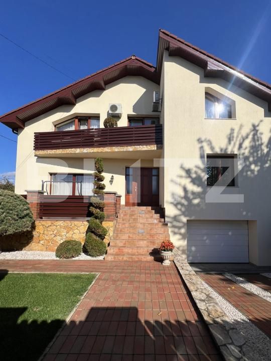 Proprietatea beneficiază de două terase acoperite (față și spate), un balcon în partea frontală și o curte amenajată cu gazon și plante ornamentale, perfectă pentru relaxare.