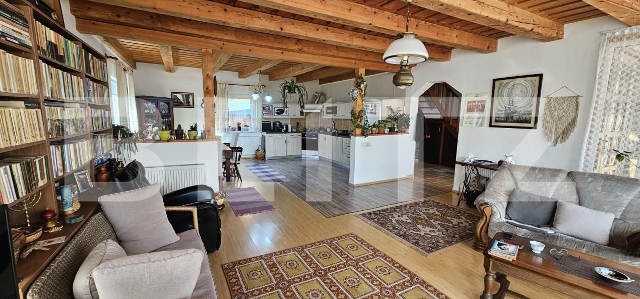 Locuința este compartimentată eficient, iar la parter se deschide un hol primitor care face trecerea către o baie cu cabină de duș și către zona de zi amenajată în concept open space. Bucătăria se îmbină armonios cu sufrageria și camera de zi, formând un spațiu amplu, extrem de luminos, datorită ferestrelor generoase dispuse pe întreaga latură a încăperii. Lumina naturală pătrunde din abundență și pune în valoare tavanul cu grinzi aparente din lemn, pardoseala în tonuri calde și atmosfera plăcută, de inspirație rustic-modernă. Zona de relaxare oferă un cadru ideal pentru momente petrecute în familie sau cu prietenii, într-un spațiu aerisit, cald și primitor.