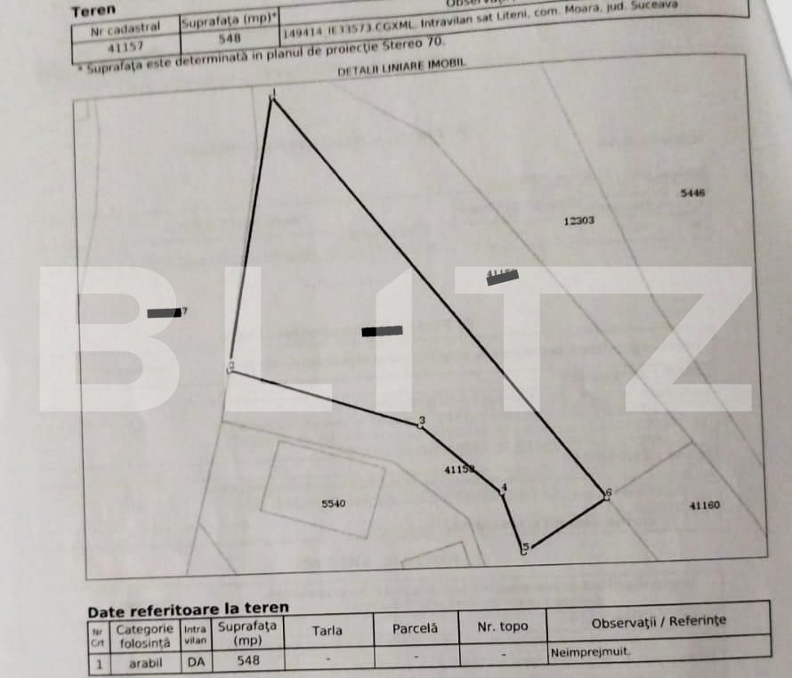 Blitz oferă spre vânzare teren intravilan, cu suprafața de 1000 mp, situat în Localitate Liteni, Comuna Moara, Județul Suceava, cu front 27,8 ml la drum public.