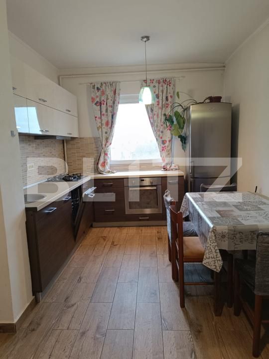 Living spațios și luminos dotat cu aer condiționat și mobilat cu acces la balconul închis unde se află centrala proprie pe gaz Baxi, dormitor mobilat, baie cu cadă mare și geam aerisire