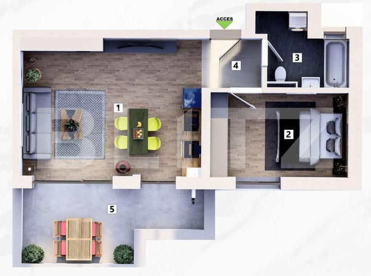 Livingul generos este perfect pentru relaxare sau socializare, în timp ce dormitorul, luminos și primitor, devine refugiu ideal după o zi aglomerată. Balconul adăugat oferă un loc perfect pentru a savura cafeaua de dimineață sau pentru a vă relaxa în serile călduroase.