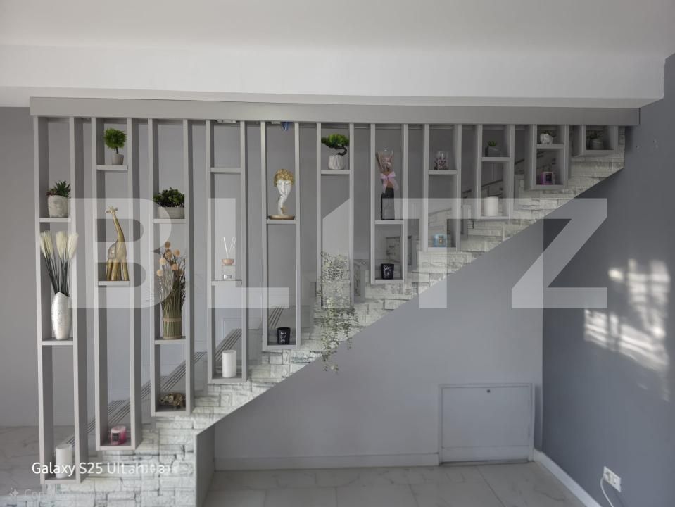 Blitz ofera spre vanzare n duplex superb de vânzare în Dumbrăvița, situat într-o zonă liniștită. Acest imobil oferă confort și eleganță într-o locație de vis, perfect pentru cei care apreciază o viață modernă și relaxantă. Terenul generos de 300 m² și frontul stradal de 10 ml completează această ofertă extraordinară. La parter, vei găsi un living spațios, o bucătărie generoasă mobilată, o baie cu duș și o cameră de depozitare, toate gândite pentru confortul tău. De asemenea, terasa mare este perfectă pentru momentele de relaxare în aer liber. Etajul este compartimentat astfel: un dormitor mare cu dressing, un dormitor cu balcon și o baie cu cadă, oferindu-ți tot confortul de care ai nevoie. Casa, construită în 2020 din cărămidă porotherm și izolată cu polistiren de 10 cm, dispune de tâmplărie Salamander cu geam tripan și site împotriva insectelor. Încălzirea la parter este prin pardoseală, cu un sistem Purmo și termostat propriu wifi, iar etajul este încălzit cu radiatoare și termostate pentru fiecare cameră, toate acestea controlate de o centrală Saunier Duval. Imobilul este racordat la gaz, curent monofazat, internet și televiziune prin fibră, are fosă și foraj, precum și panouri fotovoltaice de 6 kW (prosumator). Casa este protejată cu un sistem de alarmă Ajax și cablaj pentru camere de supraveghere la exterior. Curtea oferă alei pavate sau betonate, un garaj tip carport de 28 m² pe structură metalică și o poartă automată controlată de la distanță. Grădina este amenajată cu flori, pomi ornamentali și fructiferi, viță de vie și o zonă pentru legume, iar gazonul este dotat cu plasă anti-cârtiță și este irigat automat prin aspersoare și furtun de picurare, toate controlate de la distanță. Acest duplex este alegerea perfectă pentru cei care doresc să trăiască într-un loc modern, bine echipat și situat într-o zonă deosebit de liniștită. Nu rata ocazia de a transforma această casă minunată în acasă pentru tine și familia ta!