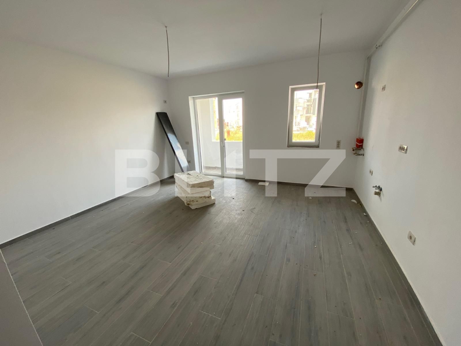 Apartamentul este situat la etajul 4 al unui bloc cu 4 etaje, unde mai sunt disponibile si alte apartamente, de 1 si 2 camere, la fiecare etaj, si este desfasurat astfel: hol, living open space cu bucatarie si baie, la pachet cu un loc de parcare inclus in pret. Apartamentele vor fi disponibile de la data de 01.10.2022.